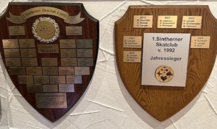 Am 06.01.2026 nahm der Vorsitzende des 1. Sintherner Skatclubs von 1992 Dieter Schnecke die Siegerehrung der Clubmeisterschaft 2025 vor. Die Clubmeisterschaft 2025 wurde von 21 Skatfreunden gespielt. Clubmeister wurde Kurt Langer mit 31357 Punkten. Platz 2 und 3 belegten Frank Bertram und Michael Hetz mit 29549 und 28799 Punkten. Der Vorsitzende Dieter Schnecke gratulierte Kurt Langer zu der bereits 13. Clubmeisterschaft; Michael Hetz zum 3. Platz und Frank Bertram zum 2. Platz der Clubmeisterschaft und zum Gewinn der Online-Clubmeisterschaft im 1.Sintherner Skatclub.